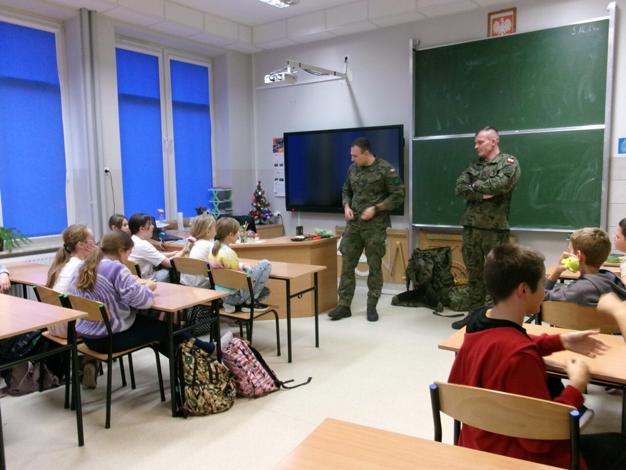Wzięliśmy udział w kolejnej edycji programu edukacyjnego – obronnego „Edukacja z wojskiem. Edycja II”. Celem przedsięwzięcia jest popularyzowanie wiedzy w obszarze bezpieczeństwa i tematyki obronności. W czasie zajęć piątoklasiści zapoznali się z zagadnieniami dotyczącymi obrony cywilnej, cyberbezpieczeństwa, systemu alarmowania, prawidłowych zachowań w czasie sytuacji kryzysowych oraz elementów ratownictwa medycznego. Zajęcia przeprowadzili żołnierze Sił Zbrojnych Rzeczypospolitej Polskiej z Centrum Szkolenia Wojsk Inżynieryjnych i Chemicznych we Wrocławiu. Szkolnym koordynatorem działań była nauczycielka edukacji dla bezpieczeństwa, p. Barbara Czuba – Pawłowska.