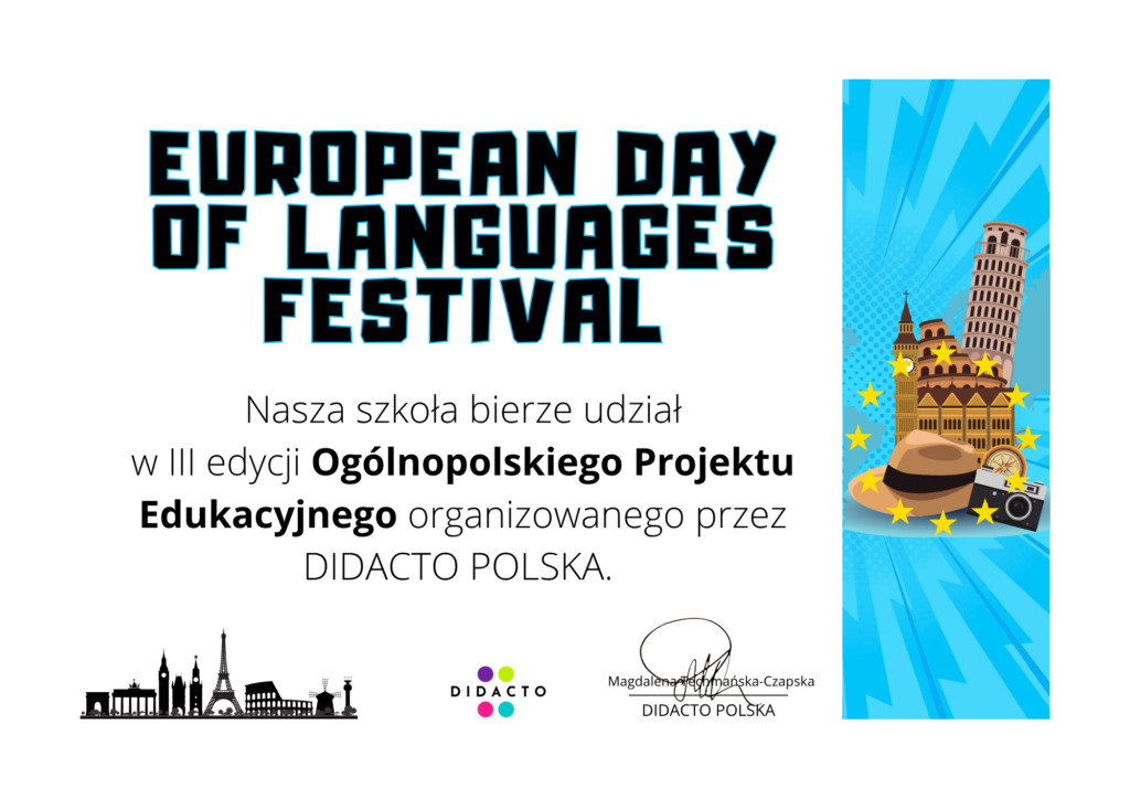26 września obchodzony jest Dzień Języków Europejskich, który promuje różnorodność języków i ich naukę w każdym wieku. Z tej okazji w naszej szkole uczniowie klas IV – VIII wzięli udział w Ogólnopolskim Projekcie Edukacyjnym – “European Day od Languanges Festival” organizowanym przez Didacto Polska. Na zajęciach języka angielskiego uczniowie aktywnie uczestniczyli w karaoke w różnych językach. Po zapoznaniu się z informacjami i ciekawostkami na temat języków europejskich, rozwiązywali ciekawe quizy. Dziękujemy wszystkim uczniom za zaangażowanie!