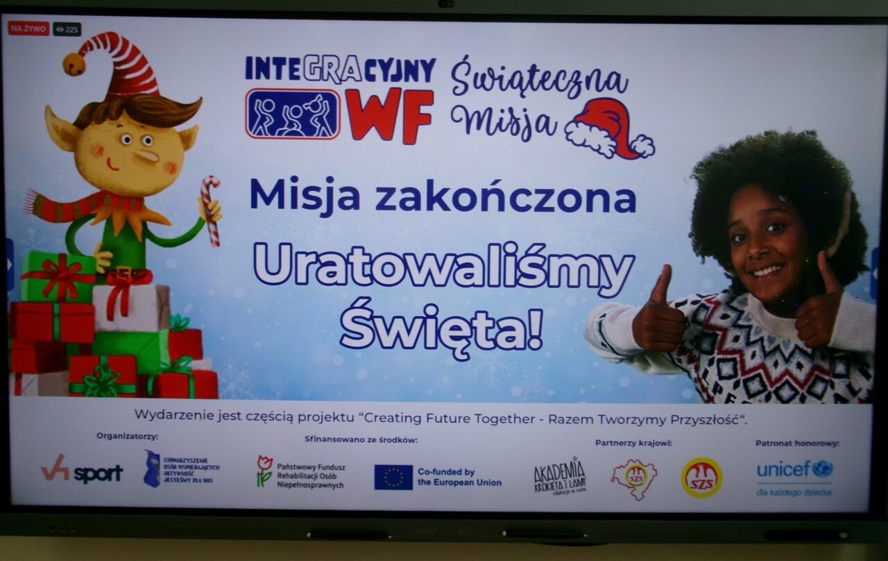 W niezwyczajnej lekcji wychowania fizycznego, 11 grudnia, wzięli udział uczniowie z klasy III i klasy V a. Jak to na wychowaniu fizycznym był ruch i były ćwiczenia, ale niecodzienne, bo…to były zajęcia online! Ćwiczyliśmy z uczniami z całej Polski, a lekcję poprowadziła pani Kasia Kozikowska, paraolimpijka, uprawiająca kajakarstwo. Celem akcji była promocja aktywności fizycznej i integracji dzieci, a data wydarzenia jest nieprzypadkowa, ponieważ w grudniu obchodzimy Międzynarodowy Dzień Osób z Niepełnosprawnościami. Akcja Integracyjny WF – Świąteczna Misja została objęta honorowym patronatem UNICEF Polska. Szkolnym koordynatorem wydarzenia była p. Barbara Czuba – Pawłowska, nauczycielka edukacji wczesnoszkolnej i Rzecznik Praw Ucznia, wspierana przez p. Elżbietę Fortunę, nauczycielkę wychowania fizycznego.