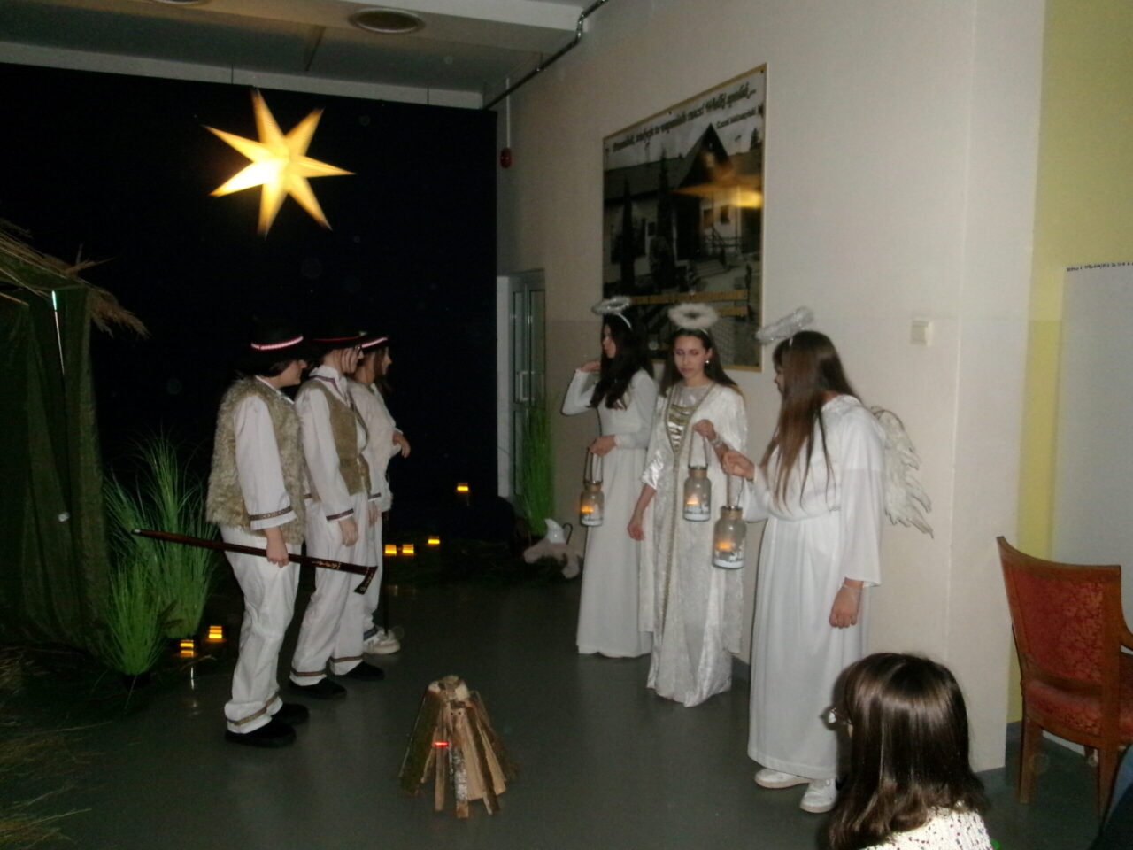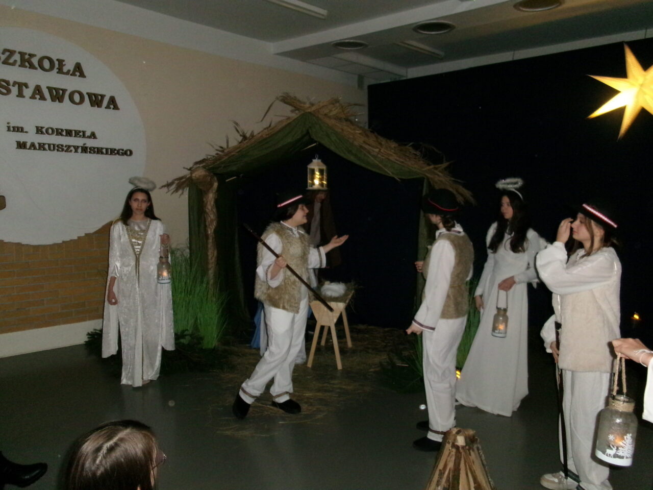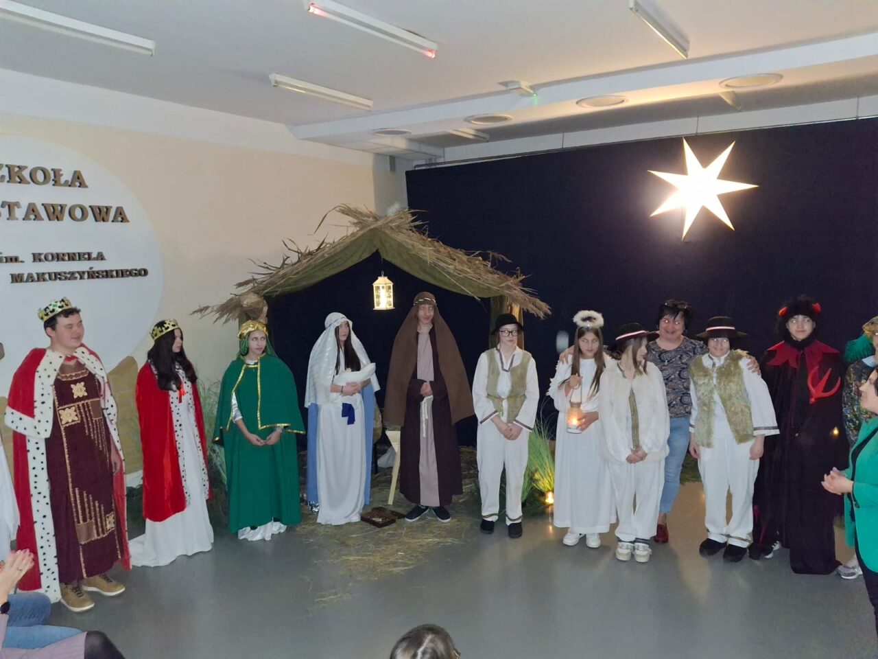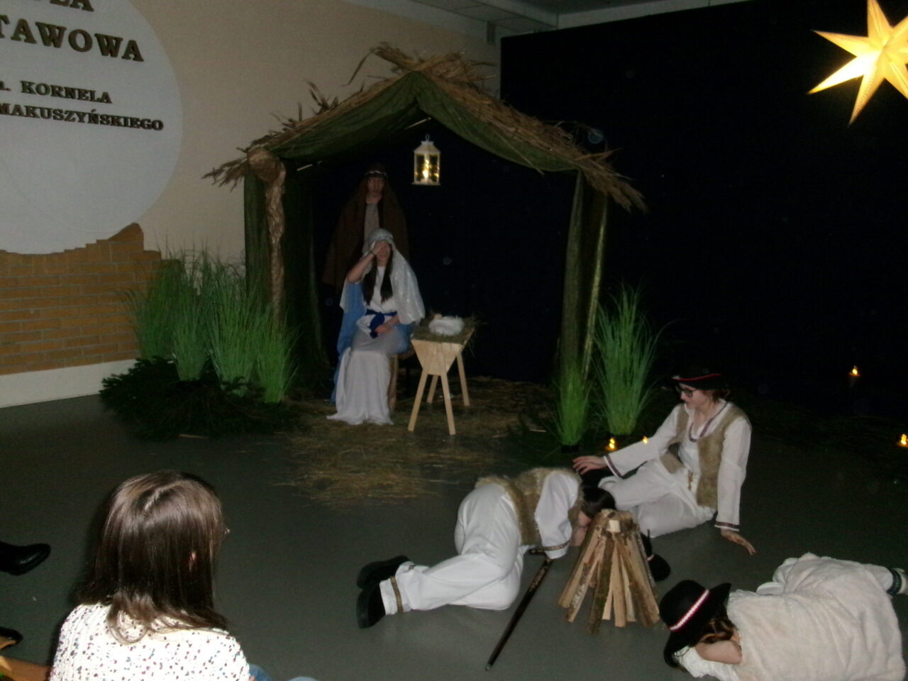 Przedstawienie było krótkie, klasyczne i bardzo klimatyczne. Stajenka pokryta trzciną, zapach prawdziwego siana w żłóbku i świerkowego igliwia sprawił, że na chwilę wszyscy się zatrzymali i zadumali… I o to tak naprawdę chodziło. A najpiękniejszą nagrodą dla aktorów były wzruszone uśmiechy najważniejszej publiczności – Rodziców. Brawo, ósmaki!!