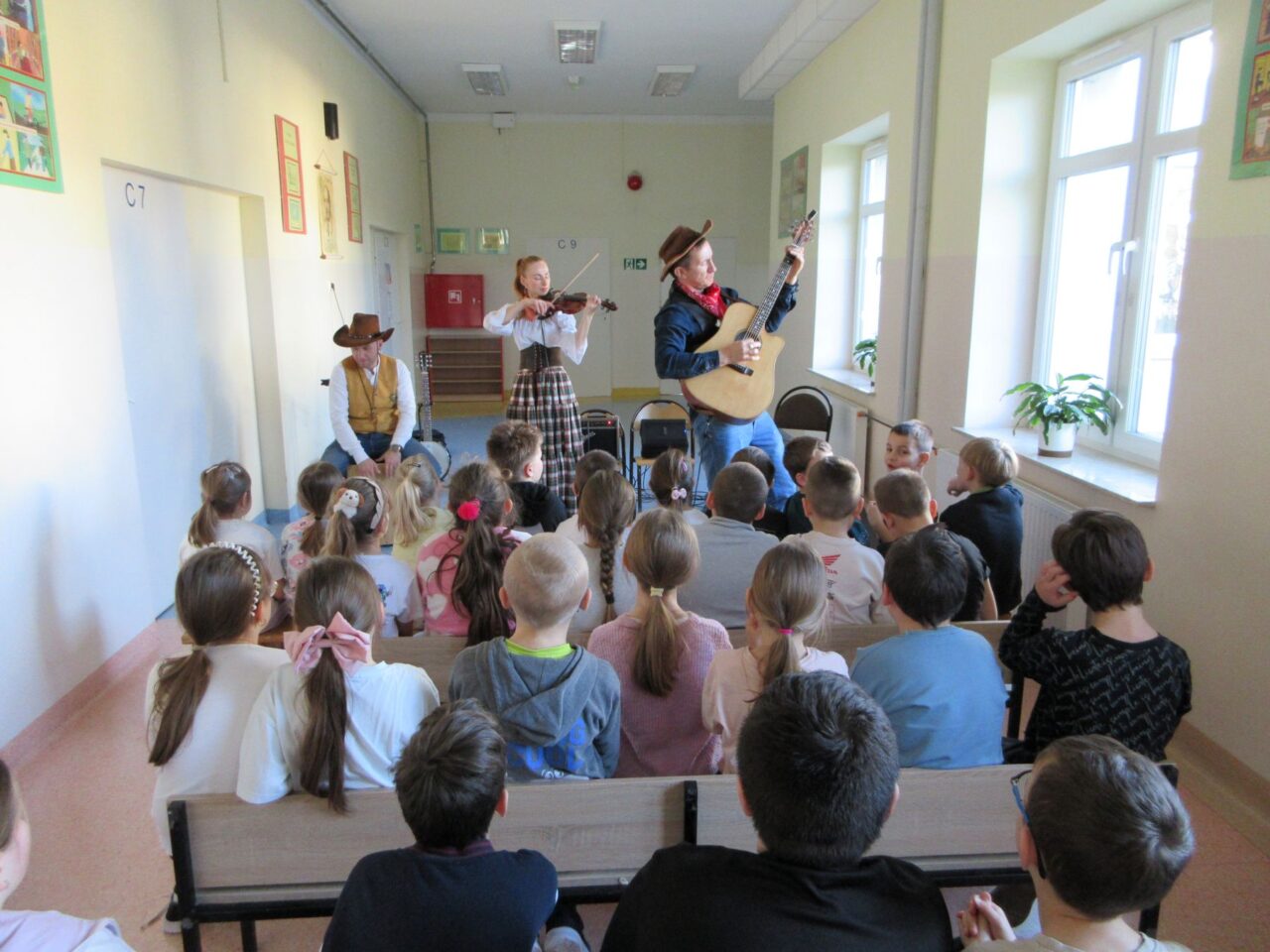 Uczniowie mogli usłyszeć energiczne melodie, ballady pełne emocji oraz opowieści o wolności, przyjaźni i życiu na bezkresnych preriach. Nie zabrakło też humoru, ciekawostek o instrumentach oraz wspólnego klaskania i śpiewania.