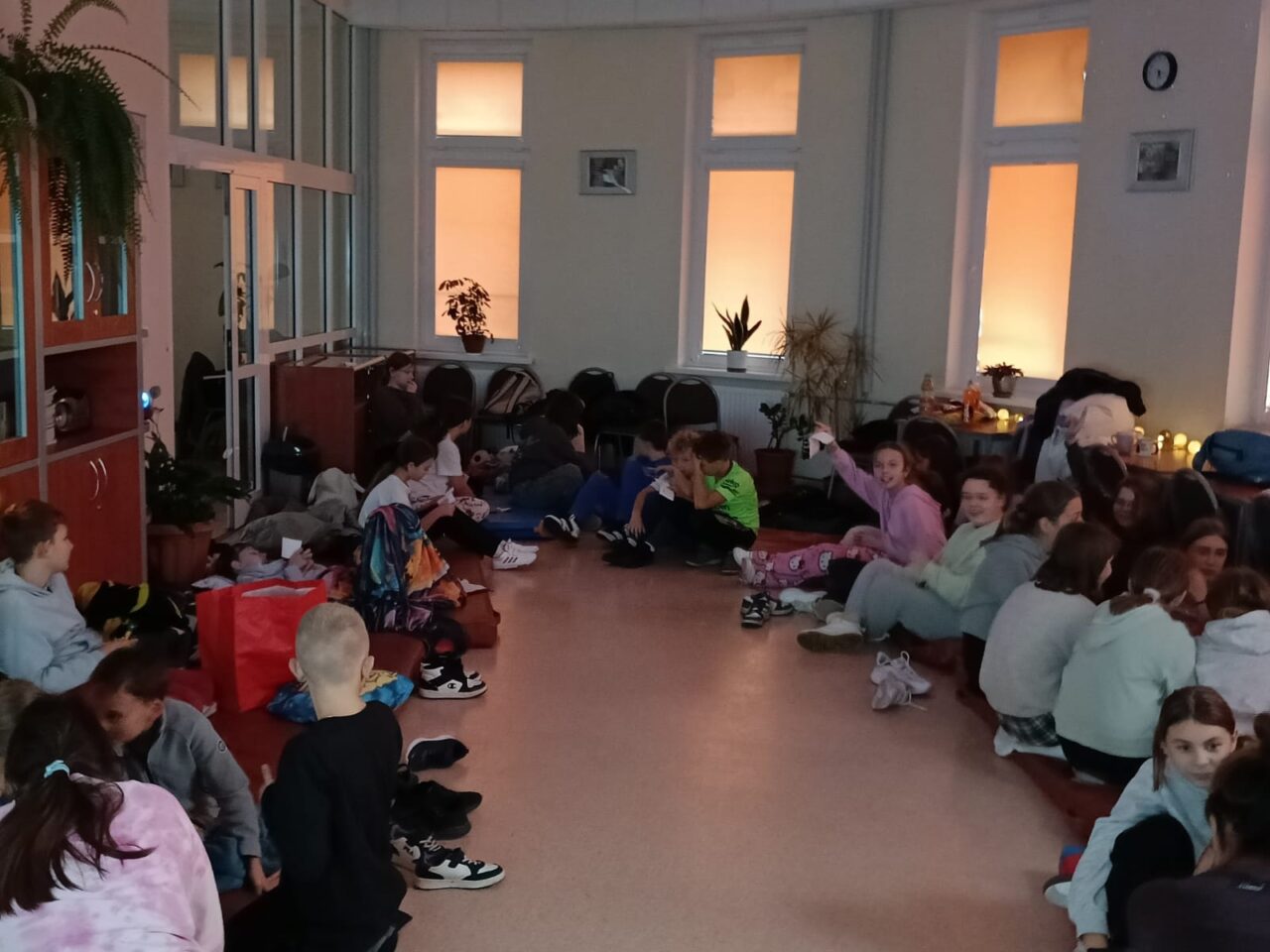 W czwartkowy, jesienny wieczór w naszej szkole odbyło się niecodzienne spotkanie –Noc Bibliotek! W kameralnej, owianej tajemnicą atmosferze, uczniowie wspólnie spędzili czas na wielu ciekawych aktywnościach. Aby każdy mógł poczuć niezwykłą aurę tego wieczoru, odczytano pełen zagadek list. Dzieci z zapałem i uśmiechem starały się rozwikłać każdą zagadkę z listu i wykonać wszystkie jego polecenia. Każdy miał okazję opowiedzieć, jakie gatunki książek lubi najbardziej – od przygodowych, przez fantastyczne, aż po detektywistyczne! Zmierzyły się z zagadkami, które pobudziły ich wyobraźnię i spryt. Potem przyszła pora na grę „Jak było kiedyś, a jak jest teraz?”, podczas której uczniowie porównywali dawne czasy z teraźniejszością – było przy tym dużo śmiechu