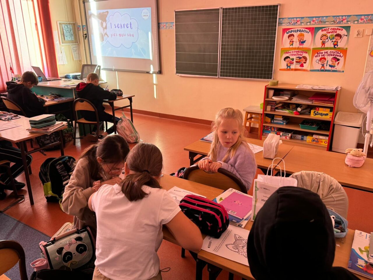 Klasa IV zrealizowała kolejne zajęcia w ramach projektu Psia Lekcja. Tematem zajęć było: „10 psich sekretów. Co robić, a czego nie robić? Rozmawialiśmy o potrzebach psów i innych zwierząt, zwłaszcza teraz, kiedy nadchodzi zima. Uczniowie starali się odpowiadać na pytanie: „Jak powinna wyglądać opieka nad psem i co mogą robić, a czego nie powinny przy kontaktach z psem?”. Na koniec zajęć każdy starannie pokolorował przygotowaną kolorowankę.