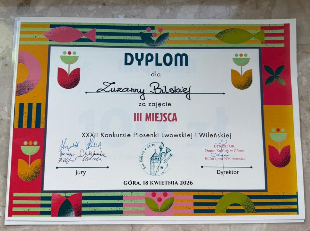 Z przyjemnością informujemy, że 18 kwietnia nasza uczennica, Zuzanna Bilska, wzięła udział w XXXII Konkursie Piosenki Lwowskiej i Wileńskiej. Jej występ został wysoko oceniony przez jury, a zdobyte III miejsce jest kolejnym pięknym osiągnięciem wokalnym.