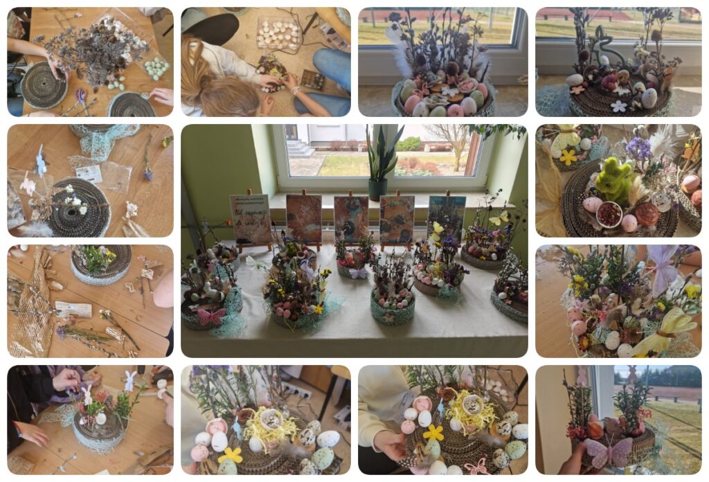 Powstałe prace zachwycają swoją różnorodnością, starannością wykonania oraz bogactwem kolorów. Każda kompozycja jest wyjątkowa i pokazuje ogromną wyobraźnię oraz zdolności plastyczne uczniów. Wiosenne barwy, delikatne dekoracje oraz naturalne elementy sprawiły, że stroiki doskonale oddają klimat nadchodzących Świąt Wielkanocnych. Warsztaty były nie tylko okazją do rozwijania talentów plastycznych, ale także do wspólnej zabawy, współpracy i wprowadzenia się w świąteczny nastrój.